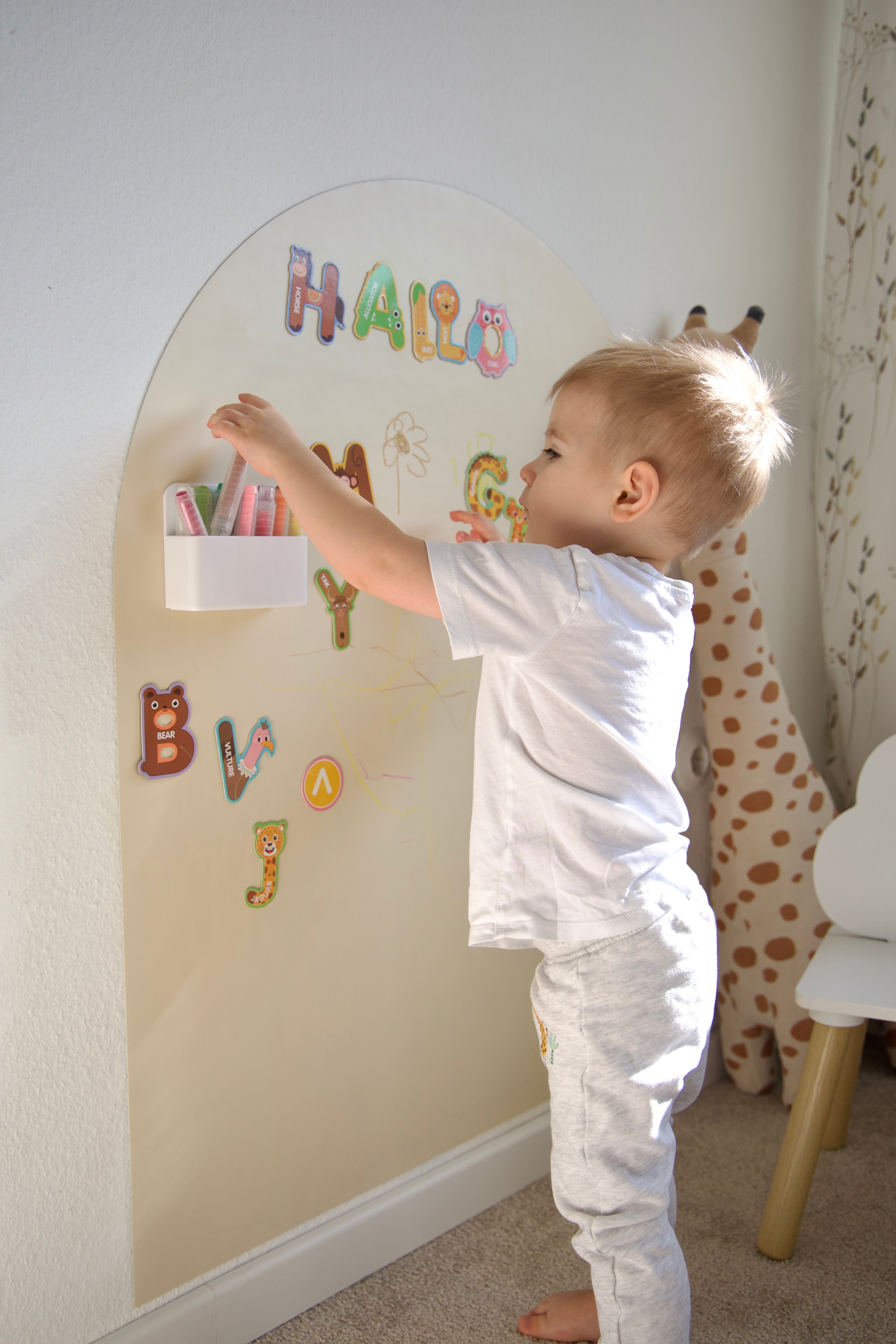 The LittleArtifex™ Magnetic chalkboard can be installed on most surfaces - including light-textured wallpaper, wood and glas.